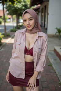 Mungkin Nyai Halimah merasa kegerahan setelah memakai baju panjang dan rambutnya selalu tertutup jilbab seharian Penampilan khas perempuan cantik itu sebagai isterinya pak Kiayi, bila ia berada diluar rumah mesti memakai pakaian yang menutupi seluruh tubuhnya Walaupun sekujur tubuhnya tertutup baju panjang dan jilbab masih nampak seksi dan anggun, malam itu benar-benar membuatku jadi terpana dan bergairah ingin memeluk tubuhnya