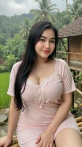 Selesai mandi Dwi hanya mengenakan baju kaosku, cukup si buat dia, cuma jadi kaya make rok min saja. 15cm di atas lutut. Paha dan betis yang tidak ditutupi kaosku itu tampak amat mulus. Kulitnya kelihatan licin, dihiasi oleh rambut-rambut halus yang pendek. Pinggulnya yang besar melebar. Pinggangnya kelihatan ramping. Walaupun kaos iru gombrong, tapi kelihatan sekali bentuk toketnya yang besar kenceng itu, sangat menggairahkan, palagi pentilnya tercetak di kaos itu. Rupanya Dwi tidak mengenakan bra. Lehernya jenjang dengan beberapa helai rambut terjuntai.